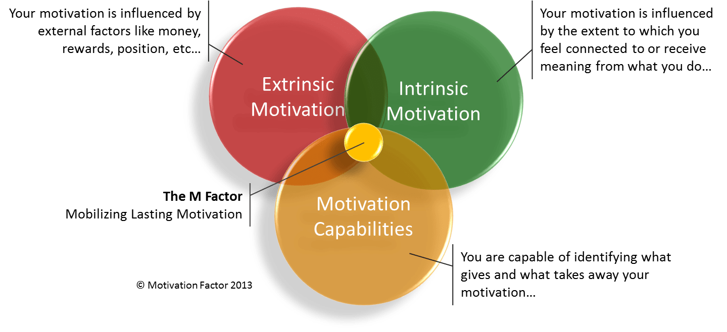 Over het algemeen worden er in bedrijven aanzienlijke middelen geïnvesteerd om de externe motivatie te verbeteren. De nadruk ligt vaak op de werkomgeving en organisatorische en bestuurlijke aspecten. Metingen, uitgevoerd door Boston Research, tonen echter aan dat externe motivatiefactoren slechts ongeveer de helft van 'de waarheid achter de zeer gemotiveerde werknemer' dekken. De resterende 45% van onze motivatie is gerelateerd aan: